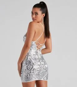Step into the party in style in this stunning sequin mini dress! It features a plunging wired V-neckline that adds structure, a padded bust to offer support, spaghetti straps that lead to a lace-up back design for a customized fit, and a short, curve-hugging silhouette. The dress showcases gorgeous all-over sequin embroidery in a chic scroll pattern that will glow from all your best angles. Complete your look with rhinestone earrings and