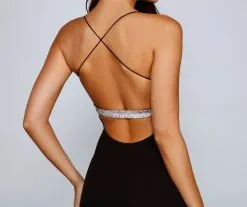 Give off a sultry glamorous vibe in this stunning backless mini dress. It features a sleeveless square neckline, bungee spaghetti straps, an open back with a cross-back strap design, a lower back bar strap with mini rhinestone embellishment, and a short, curve-hugging silhouette. Style this dress with
