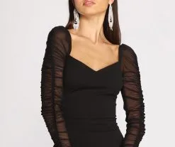 - Long fitted sheer ruched sleeves | Puff shoulders