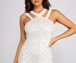 Illuminate the room in a sequin dress for your next special evening in our shimmering Tara dress! She features a sleeveless high neck with a racer bust, tank-like straps for support, and a shimmering geometric sequin design. Her relaxed fit bodice leads to a sweeping floor-length silhouette with a bold high slit, and a mini skirt length knit lining. Complete your formal outfit with