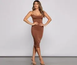 Take your look to a luxe level with a stunning midi dress that creates a head-turning moment! The dress features a sleeveless cowl neckline, spaghetti straps, and a midi-length silhouette. The dress is composed of a smooth knit fabric that offers a form-hugging fit with a moderate stretch. Complete look with