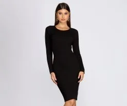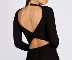Give your basics a little twist of glam to create a captivating look! Dress features a crew neck with a single button closure at the nape of the neck, fitted long sleeves and a bold open back that leads to twist knot design. Dress is composed of ribbed knit fabric that offers a form hugging fit with a moderate stretch.