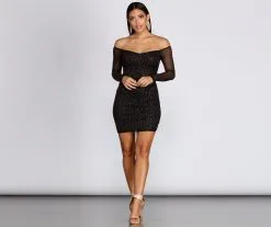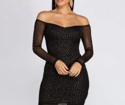 Shine under the lights with this sparkling mini dress! It features an off the shoulder neckline, a sweetheart bust, unlined fitted long sleeves and a mini length. She is composed of lined mesh fabric that offers a form hugging fit with a moderate stretch. Dress is adorned with glitzy heat stones throughout! Includes a back zipper closure with hook and eye clasp.
