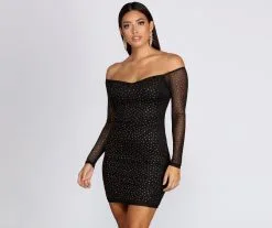 Shine under the lights with this sparkling mini dress! It features an off the shoulder neckline, a sweetheart bust, unlined fitted long sleeves and a mini length. She is composed of lined mesh fabric that offers a form hugging fit with a moderate stretch. Dress is adorned with glitzy heat stones throughout! Includes a back zipper closure with hook and eye clasp.