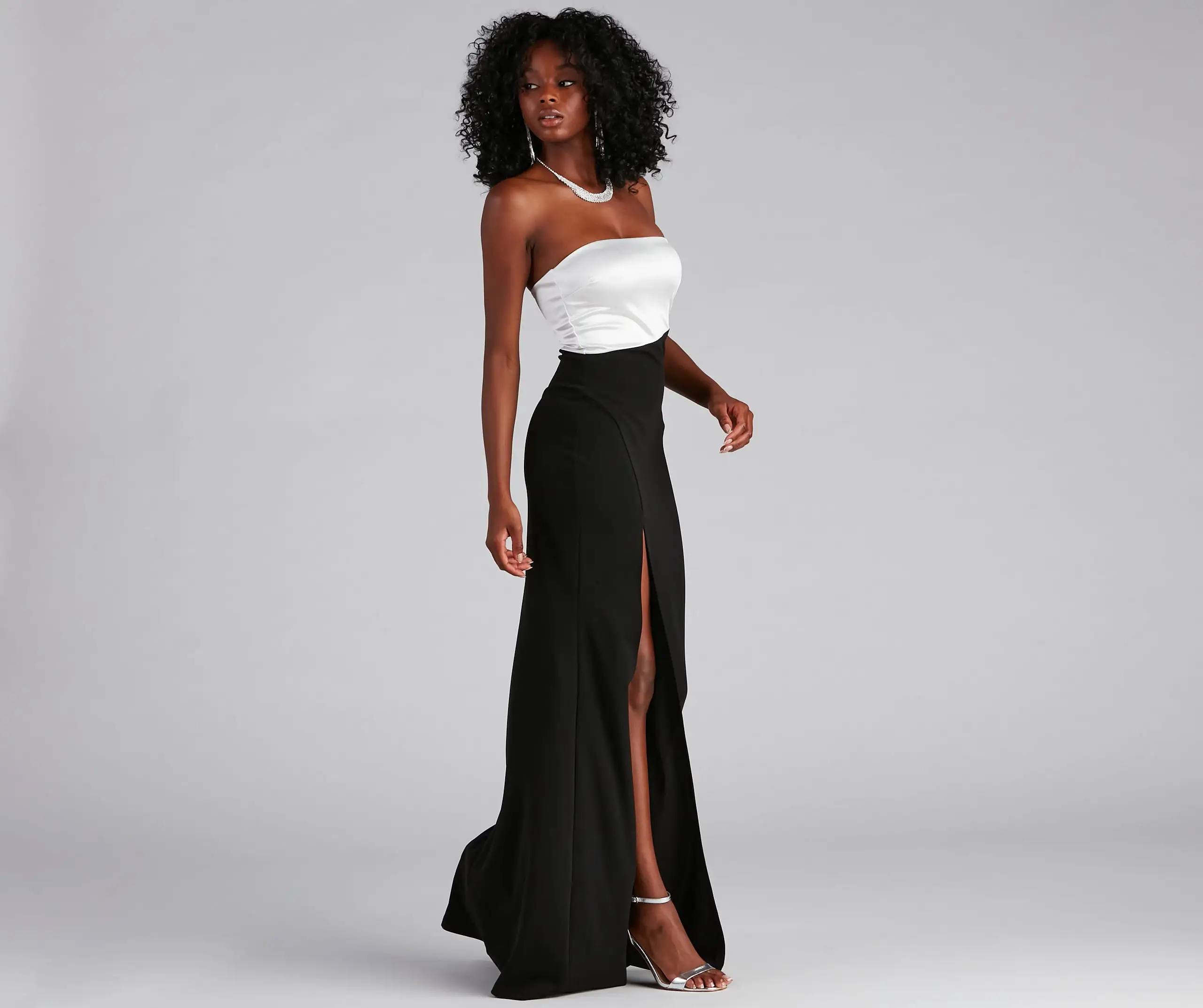Show up and stun in the classic and chic Vanessa strapless formal dress! She features a two-tone design with a sleek satin bodice with a square neckline, a crepe knit skirt with an asymmetrical high waist seam, and a fitted floor-length silhouette with a sultry thigh-high side slit. Style this dress with a pair of strappy