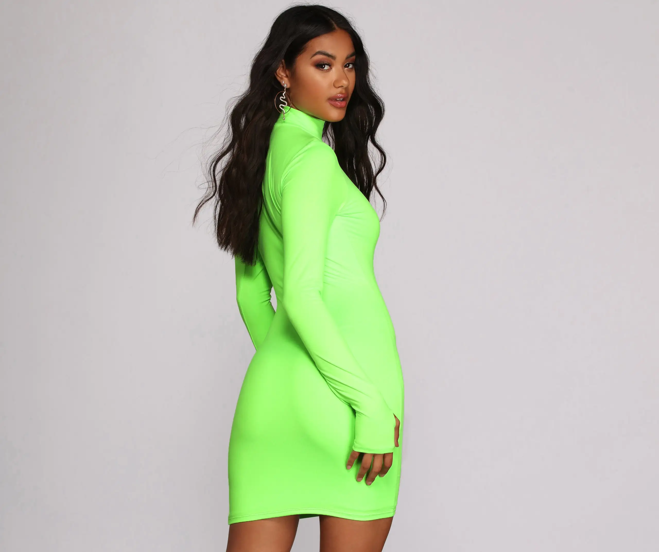 Talk the talk and walk the walk in this must have mini dress! It features a sleek, form hugging silhouette with a mock neck, long sleeves with thumb-hole slits, and a mini length. Brushed knit offers plenty of stretch.