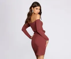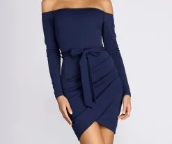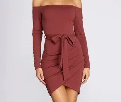 Take your look to the next level with this pretty mini dress! It features an off the shoulder neckline, fitted long sleeves, a cinching tie waist belt with loops and an asymmetrical mini length silhouette with a ruched detailing. Dress is composed of a lined crepe fabric that offers a curve hugging fit with a moderate stretch. Zipper not included.