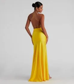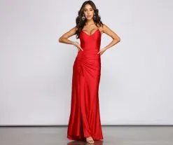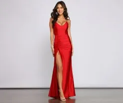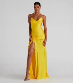 Bring the elegance to your look with a formal dress that wows! The dress features a sleeveless V-neckline with padded cups, spaghetti straps, a lace-up back, a high side slit with a ruched drawstring, and a mermaid silhouette. The dress is composed of a smooth knit fabric that offers a form-hugging fit with a moderate stretch. Complete look with a